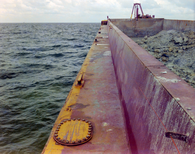 The red hull and deck of a large barge. A container on the barge contains mounds of sand. Photo taken for Fowler and White.