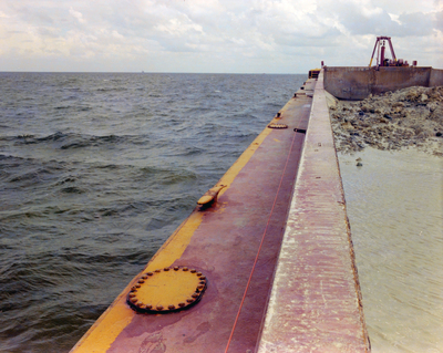 The red hull and deck of a large barge. A container on the barge contains mounds of sand. Photo taken for Fowler and White.