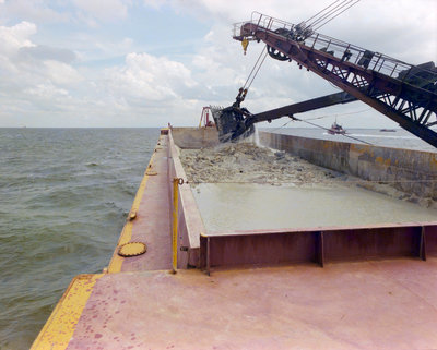 The red hull and deck of a large barge. A container on the barge contains mounds of sand. Photo taken for Fowler and White.