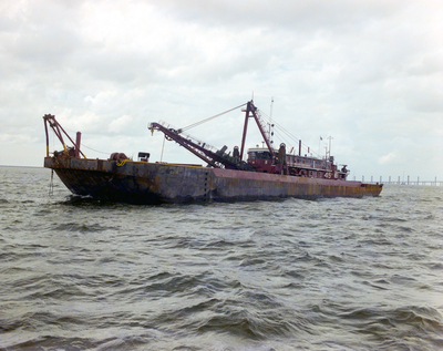 Gandy, George Skip IV, "Unidentified Red Barge and Dredge for Fowler and White, E" (1980). Gandy Photographs - General, Culture, Politics. Image 4924.