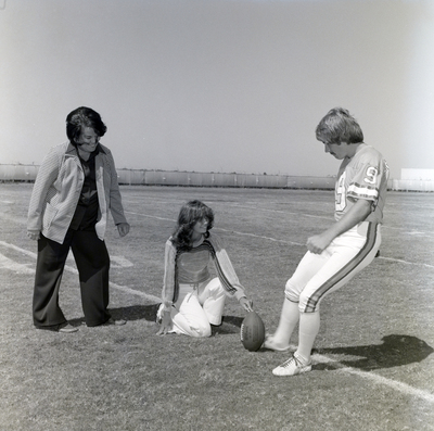 A boy kicks a football while two women look on. One was holding the football for kicking while the other is standing nearby. This photograph was commissioned for General Telephone & Electronics Corporation.