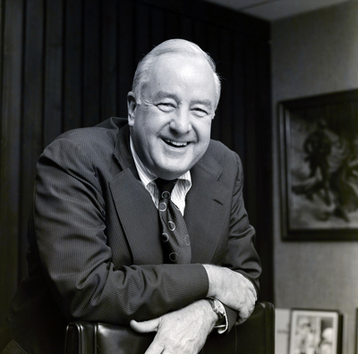 Portrait of an unidentified man with a tie with circles on it who was an employee of General Telephone & Electronics Corporation.