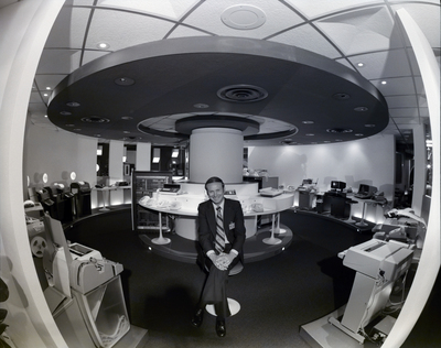 A fish-eye view of displayed computers from General Telephone & Electronics Corporation. A man sits in the center of the display room.