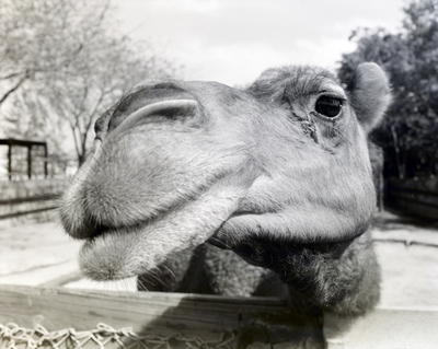 A headshot of a camel at Busch Gardens in Tampa, Florida. This photograph was taken by a General Telephone & Electronics Corporation employee.