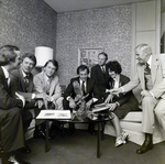 A group of General Telephone & Electronics Corporation sit in a lounge area and look at a scrapbook.