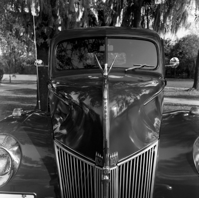 An early Ford V8 automobile at a Florida Steel Corporation building in East Tampa, Florida, circa 1974.