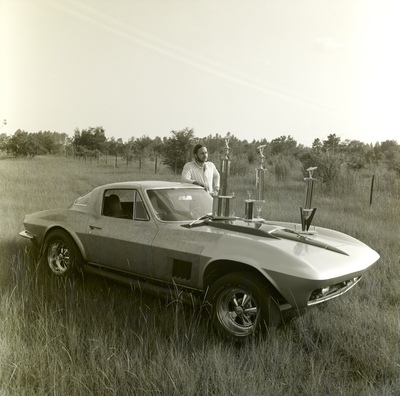 A man, presumably John Fowler, stands beside an altered 1967 Chevrolet Corvette with three car-related trophies displayed on the hood circa 1974. The photograph is related to Florida Steel Corporation.
