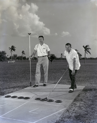 Two men play shuffleboard at the Southwest Florida Tuberculosis Hospital located at 7500 West Silver Star Road in Orlando, Florida, in 1961. Photograph taken for Florida Tuberculosis and Health Association.