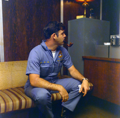 R.B. Nelson of the Tampa Police Air Service smokes a tobacco pipe indoors in February 1972.