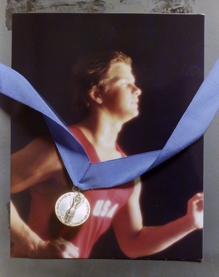 Gandy, George Skip IV, "Olympic Medal Placed Over a Portrait of an Athlete Wearing USA Jersey, A" (1980). Gandy Photographs - General, Culture, Politics. Image 5362.