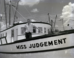 A man standing aboard a fishing vessel named "Miss Judgement."