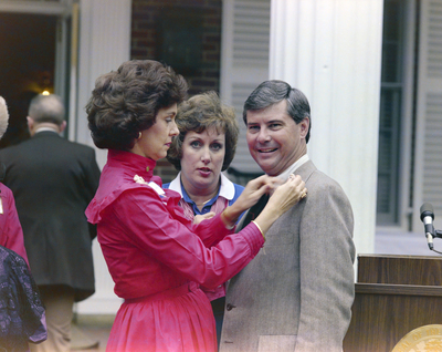 A woman putting a pin on Governor Bob Graham's suit at his Mansion Party.