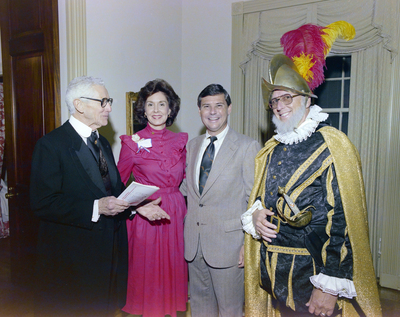 Governor Bob Graham speaks with attendees at his mansion party, where one guest is dressed in a vintage soldier costume.