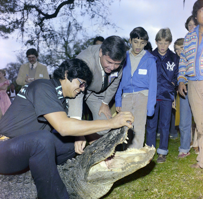 Gandy, George Skip IV, "Governor Bob Graham Petting an Alligator Under Supervision at His Mansion Party, A" (1982). Gandy Photographs - General, Culture, Politics. Image 5632.