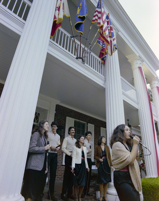 A group of singers performing on the front porch of a mansion during Governor Bob Graham's mansion party.