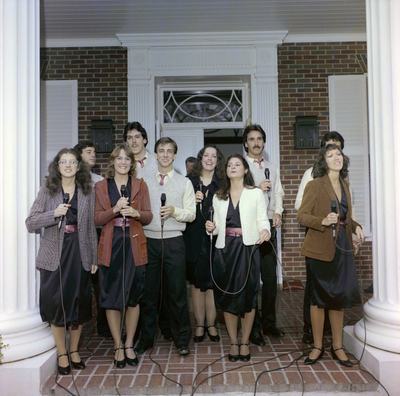A group of singers performing on the front porch of a mansion during Governor Bob Graham's mansion party.