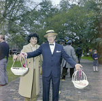 A man in a suit and hat holds baskets of ribbons and small gifts, surrounded by attendees at the Governor's Mansion Party.