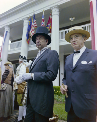 Two men in vintage formal attire attend the Governor's Mansion party.