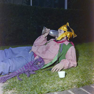 A guest in a colorful costume reclines on the grass, drinking from a large goblet at Governor Bob Graham's Mansion Party.