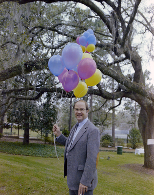 Gandy, George Skip IV, "Man Holding Balloons at Florida Governor's Mansion Party in Tallahassee, Florida" (1982). Gandy Photographs - General, Culture, Politics. Image 5714.