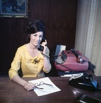 The secretary for Roger Early sits at a desk with a telephone receiver in hand. She has a Selectric I red typewriter on the desk behind her.