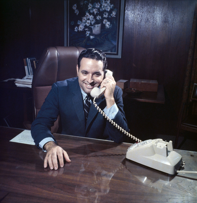 A portrait of Tampa Mayor Dick Greco sitting at a desk while on the telephone.