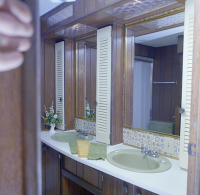 Gandy, George Skip IV, "Bathroom with Decorative Mirror and Double Sinks in Guerdon Industries Manufactured Home" (1960). Gandy Photographs - General, Culture, Politics. Image 5804.