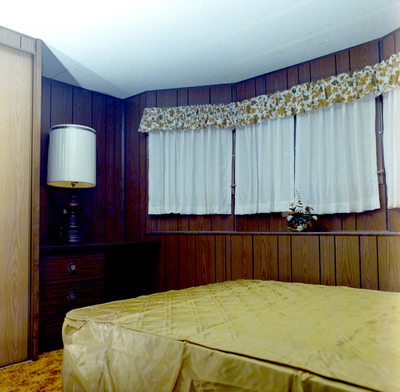 Gandy, George Skip IV, "Bedroom with Floral Curtains and Bedside Lamp in Guerdon Industries Manufactured Home, A" (1960). Gandy Photographs - General, Culture, Politics. Image 5820.