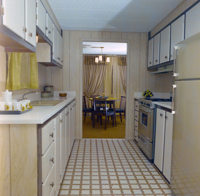 Gandy, George Skip IV, "Galley Kitchen Leading to Dining Room in Guerdon Industries Manufactured Home, A" (1960). Gandy Photographs - General, Culture, Politics. Image 5837.