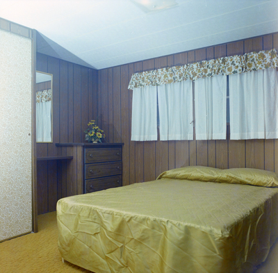 Gandy, George Skip IV, "Bedroom with Floral Curtains in Guerdon Industries Manufactured Home, D" (1960). Gandy Photographs - General, Culture, Politics. Image 5850.