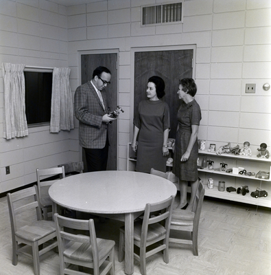 Three individuals stand near a table and chairs in a room at the Guidance Center at Manatee Junior College. Shelves with toys and items are visible in the background.