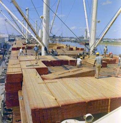 Gandy, George Skip IV, "Workers Loading Lumber onto Cargo Ship at Port of Tampa, Tampa, Florida, B" (1980). Gandy Photographs - General, Culture, Politics. Image 5905.