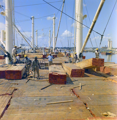 Gandy, George Skip IV, "Workers Loading Lumber onto Cargo Ship at Port of Tampa, Tampa, Florida, D" (1980). Gandy Photographs - General, Culture, Politics. Image 5906.