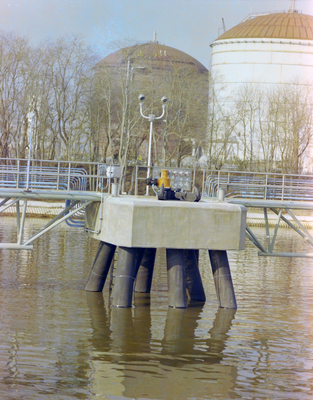 A dock platform with support pilings extending into the water, with large storage tanks and industrial piping in the background.