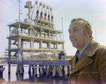 Gandy, George Skip IV, "Man Holding Hard Hat in Front of Loading Platform at Gulf Foundation, C" (1970). Gandy Photographs - General, Culture, Politics. Image 5932.