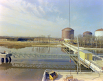 Large storage tanks and industrial buildings near a dock extending over a waterway, with a bridge and surrounding infrastructure in the background.