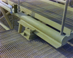 Close-up view of a metal support structure on a grated walkway, featuring a cylindrical beam secured with bolts and brackets.