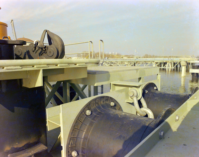 Large rubber fenders secured to a metal structure with chains and bolts at a marine docking facility. A heavy-duty hook and mooring hardware are positioned on the upper platform. Walkways extend over the water in the background.