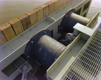 Large cylindrical dock fenders with metal chain connections mounted along a reinforced dock structure. A wooden buffer line is bolted to the edge, and a grated metal walkway is visible beside the fender system.