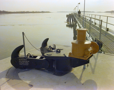 Large mooring hooks and a bollard mounted on a rotating base at a marine docking facility. Metal railings and walkways extend over the water in the background.