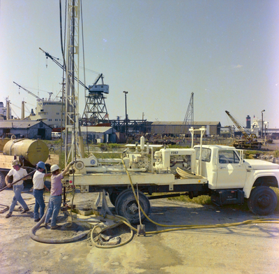 Workers operate a drilling rig mounted on a truck at Tampa Dry Dock, with cranes, ships, and industrial structures in the background.