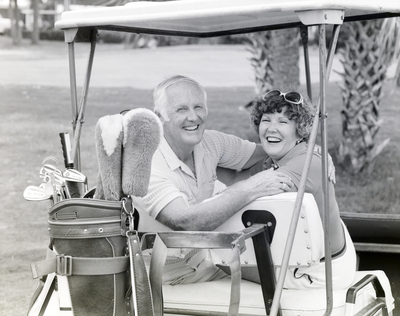 Gandy, George Skip IV, "Couple Seated in Golf Cart at Gulf Harbors, New Port Richey, Florida, F" (1970). Gandy Photographs - General, Culture, Politics. Image 6101.