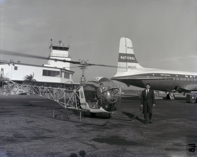 A helicopter with an exposed frame is parked on the tarmac near a National Airlines DC-6B aircraft. A control tower and terminal building are visible in the background, with a man in a suit walking nearby.