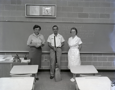 The interior of a classroom at Robinson High School in Tampa, Florida. A teacher, a custodian holding a broom, and a cafeteria worker stand in front of a chalkboard with desks in the foreground.