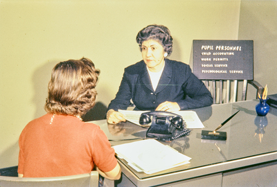 A student sits across from a staff member in a pupil personnel office discussing child accounting, work permits, and social services. A desk with papers, a telephone, and a sign listing available services are visible.