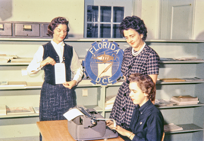Three women inside an office with bookshelves, a table, and a typewriter. One woman is typing, another is holding a booklet, and a third is standing beside a Florida DCE sign.