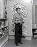 A student standing in a classroom holding an arithmetic textbook in front of a wall decorated with 1962 calendar pages. Shelves filled with books and papers are visible on the side.