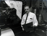 Gandy, George Skip IV, "Man Holding Newspaper in Printing Press Room, Tampa, Florida" (1960). Gandy Photographs - General, Culture, Politics. Image 6279.