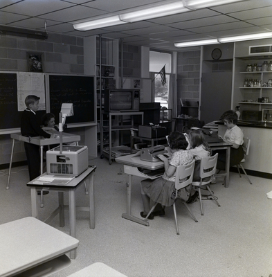 A classroom with students working at desks, using typewriters and an overhead projector, while a teacher assists a student at a standing desk. Chalkboards and educational tools are visible in the background.