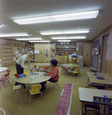 Classrooms by Houle Industries featuring dolls, teachers, various paintings displayed on the boards, and an assortment of toys.
